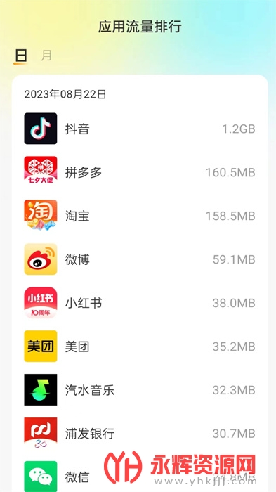 晴天流量是一款专注于监控手机流量的移动端流量监控应用软件。这款软件旨在帮助用户合理管理流量使用,节省费用。它提供直观的界面,方便用户了解应用程序的流量消耗情况。晴天流量能够实时显示各应用程序每天消耗的流量排名,帮助用户清楚了解流量使用情况,用户可以根据需求设定每月的流量使用数量,避免超额消费。如果您对这款软件感兴趣的话,不妨来永辉资源网下载体验一番吧!