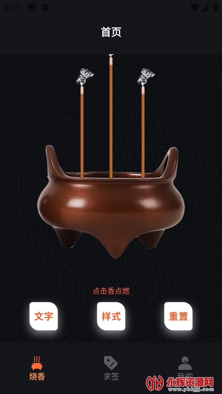 电子烧香是一款有趣的移动端模拟烧香祈福应用软件。该应用通过模拟真实的香和蜡烛,让用户在手机或平板电脑上进行虚拟烧香体验。无论何时何地,用户都可以方便地进行烧香祈福。软件可以记录用户的祈福记录和点燃香烛的时间,方便用户追溯和回顾。用户可以自行设定卜筮和祈福的内容,增加祈福仪式的真实感。软件提供多种香味选择,包括檀香、龙涎香和沉香等,让用户根据个人喜好进行烧香体验。如果您对这款软件感兴趣的话,不妨来永辉资源网下载体验一番吧!