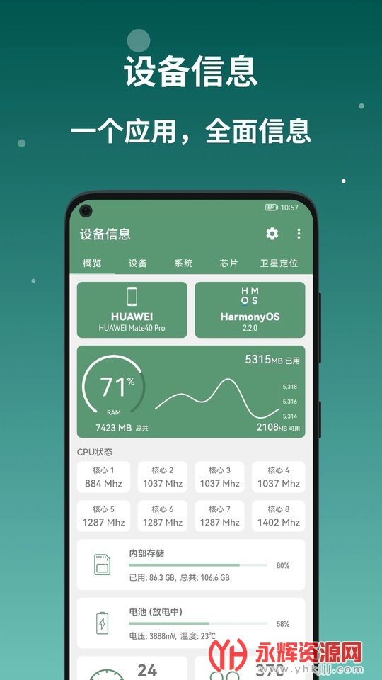 Device Info是一款移动端设备信息查看工具应用软件。它提供了一种简单方便的方式来查看手机的详细设备信息,包括CPU、RAM、存储、操作系统、传感器、电池、相机、显示器、制造商、已安装应用程序和系统应用程序等。通过该应用,用户可以轻松了解手机的硬件和软件情况。这款软件支持一键查询手机的各项详细信息,包括硬件和软件参数。如果您对这款软件感兴趣的话,不妨来永辉资源网下载体验一番吧!