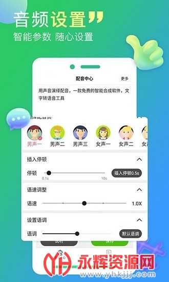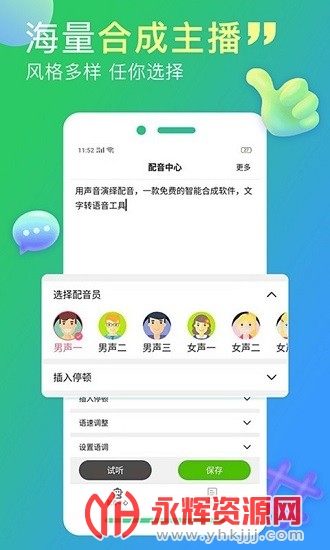 配音家是一款基于语音合成技术的专业配音软件。它提供了多种主播声音选择,包括普通话、方言、英语等多种音色,为用户提供了丰富的选择。无论是短视频、广告宣传、企业宣传片还是影视解说,配音家都能满足用户在不同场景下的配音需求。软件内置众多主播声音,可轻松切换不同风格的音频,将文字快速转换成高质量的语音,实现自动配音。=,适用于短视频制作、广告宣传、企业宣传片、影视解说等多个领域。如果您对这款软件感兴趣的话,不妨来永辉资源网下载体验一番吧!