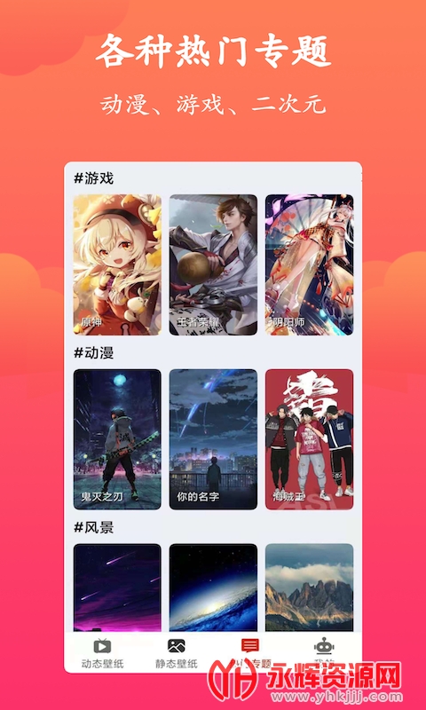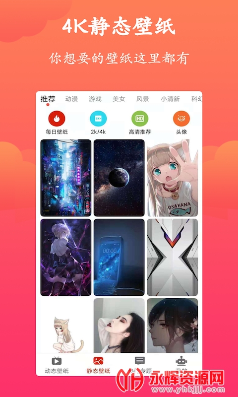 多样化的壁纸选择:涵盖了风景、动物、动漫游戏、美女明星等多个分类,满足用户个性化的壁纸偏好,让手机屏幕焕发独特魅力。