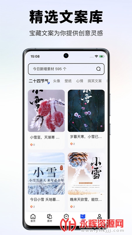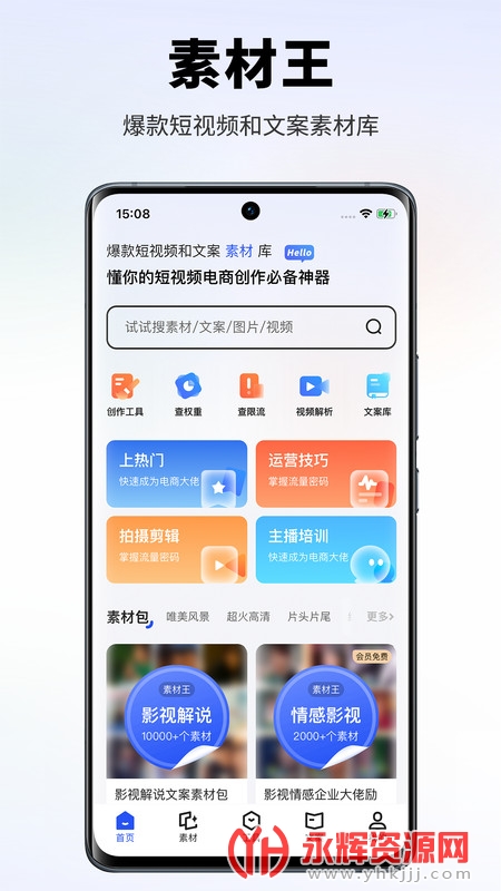 素材王是一款包含大量优质的图片、视频等常用素材的软件,在日常工作运营过程中能够发挥重要的作用。它提供了多种编辑功能,用户可以根据自己的需求进行剪辑或编辑文案,从而更好地满足用户的需求。素材王收集了大量高品质的图片和视频素材,用户可以轻松找到满足自己需求的素材。软件界面简洁易用,用户可以通过简单的操作完成复杂的编辑任务。如果您对这款软件感兴趣的话,不妨来永辉资源网下载体验一番吧!
