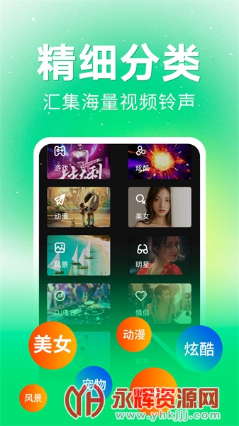 来电视频铃声是一款非常好用的移动端手机铃声设置应用软件。这款软件能够为用户提供丰富多样的个性化铃声选择,用户可以快速获得炫酷的手机铃声并进行自定义调整,同时提供免费获取的海量素材和在线编辑功能,操作简单易上手。除了来电铃声,还涵盖了闹钟铃声、短信提示音等多方面的操作,满足用户全面的音频设置需求。如果您对这款软件感兴趣的话,不妨来永辉资源网下载体验一番吧!