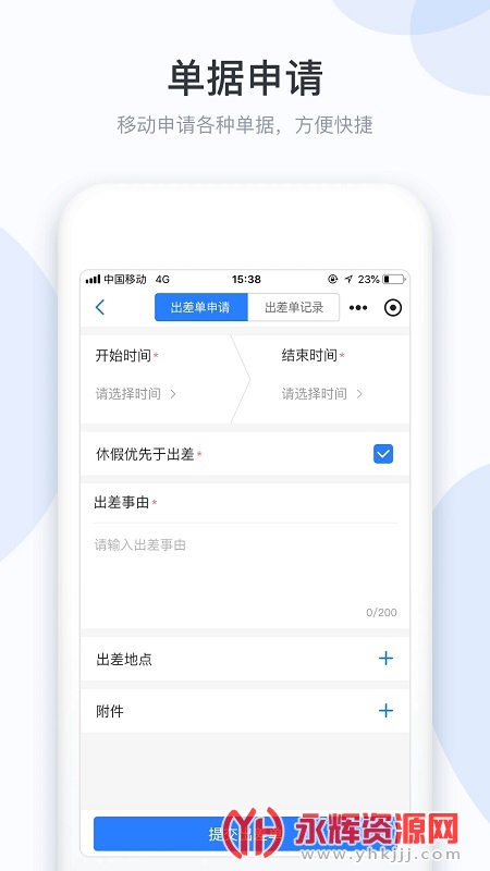 4、单据申请:支持各类单据申请的在线填写和提交,提高审批效率;