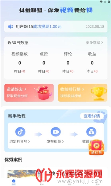 2、素材库:抖推联盟app提供丰富的素材库,包括图片、文案、视频等,帮助用户制作出更具吸引力的短视频,提高推广效果。