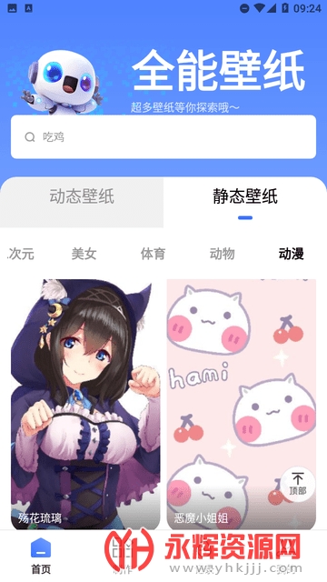 全能壁纸是一款移动端主题壁纸美化类应用软件,为用户提供丰富多样的高清精美动态和静态壁纸,让用户能够轻松个性化定制手机背景。该软件提供了超多高清精美的动态和静态壁纸,用户可以轻松一键免费设置。每日更新全网最热素材,热门精选专题推荐,让用户每天都能享受到全新的壁纸体验。全能壁纸内部包含多种类型的壁纸,而且还设有搜索框,用户可以方便地通过搜索框快速找到自己想要的壁纸类型。如果您对这款软件感兴趣的话,不妨来永辉资源网下载体验一番吧!