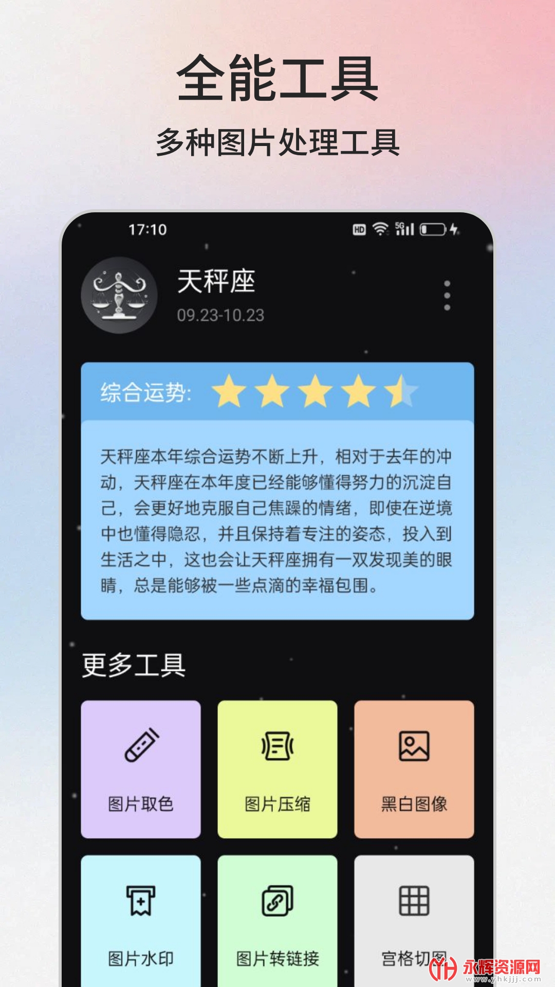 云盒工具箱是一款功能齐全且非常好用的移动端多功能工具箱应用软件。这款应用软件集成了各种实用小工具,为用户提供便捷的工具解决方案,包括星座运势、天气预报、进制转换、直尺测量、手电筒等多种工具。云盒工具箱集成多种实用工具,覆盖生活、工作等多个领域,满足用户不同需求,用户只需轻点几下即可完成各项操作,无需复杂设置。如果您对这款软件感兴趣的话,不妨来永辉资源网下载体验一番吧!