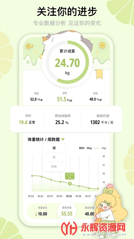 4、减重监测:应用提供减重进度和身体指标的监测功能,让用户了解自己的减肥进展和健康状况,方便用户进行调整和评估。