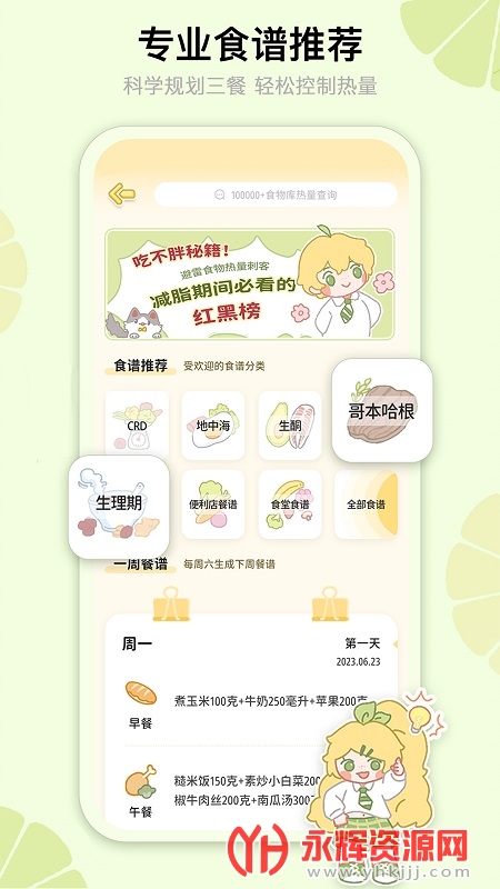 1、健康食谱:提供多种健康食谱,包括低热量、高纤维、均衡营养等,用户可以选择适合自己的食谱计划。