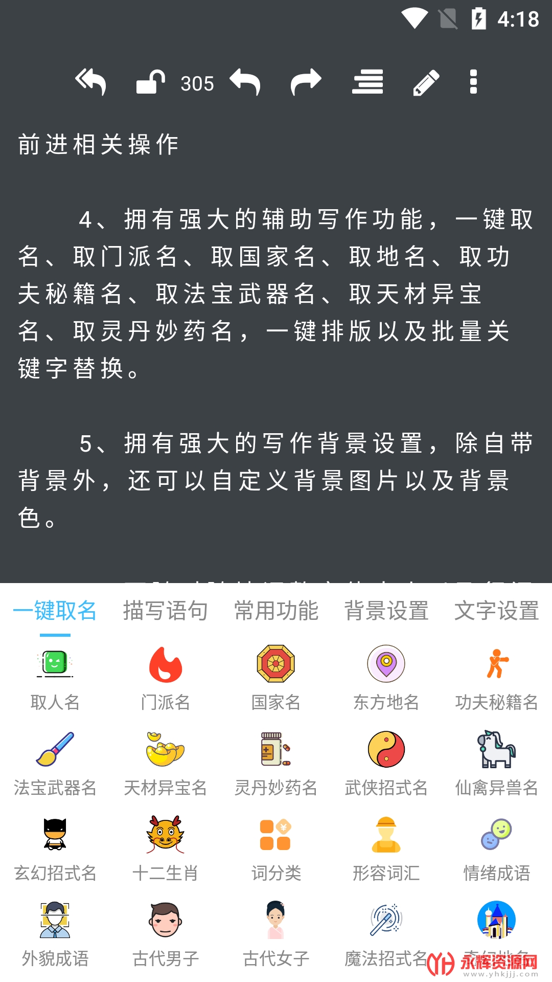 此外,它还支持多种辅助功能,如字数计算、辅助写作、一键取名以及批量关键字替换等,并且具备强大的写作背景设置,提供预设的背景,同时也支持用户自定义背景图片和背景色。
