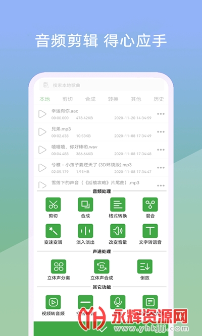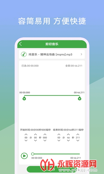 音乐剪辑器是一款非常好用且功能强大的移动端掌上专业音频编辑工具应用软件,由桂林市小目标科技有限公司开发打造。这款应用软件旨在为用户提供高质量的音频编辑和处理服务,提供了多种实用功能,如剪切、合并、调整音量、淡入淡出等,并支持各种音频格式文件的导入和导出。同时,软件还支持铃声制作、混音、合成音乐等多种特色功能,能够满足不同用户的需求。如果您对这款软件感兴趣的话,不妨来永辉资源网下载体验一番吧!