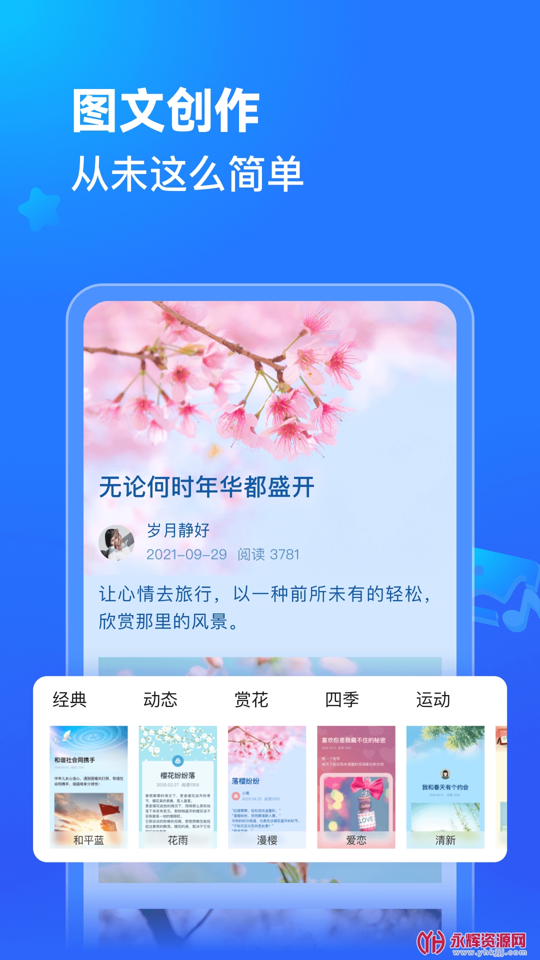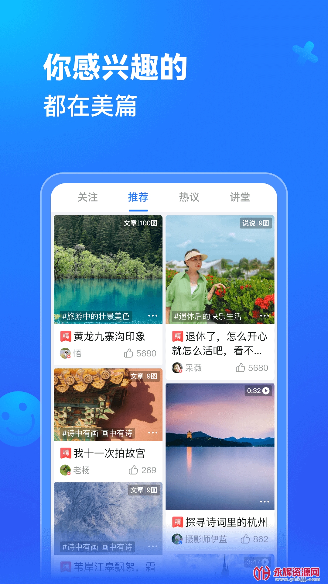 美篇制作是一款操作简单、内容丰富的图文分享型社交应用软件。它以微文魔板为特色,让用户可以发布图文并茂的文章,重新定义朋友圈的玩法。在美篇中,用户可以与其他用户分享和交流,记录生活中的美好,获取创作灵感。无论你是想成为文学大师还是寻找创意和灵感,美篇都是你的理想选择。如果您对这款软件感兴趣的话,不妨来永辉资源网下载体验一番吧!