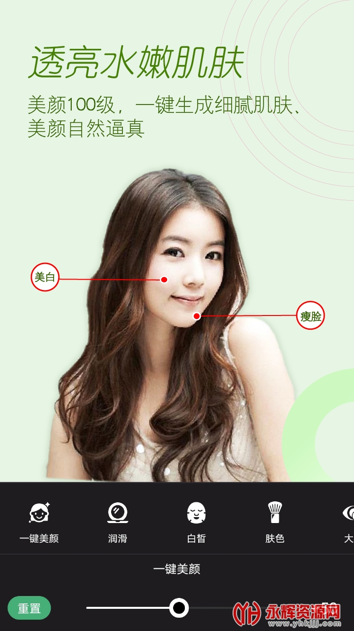 多样化美颜工具:包含皮肤平滑、美白、瘦脸等功能。