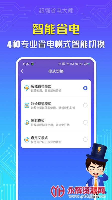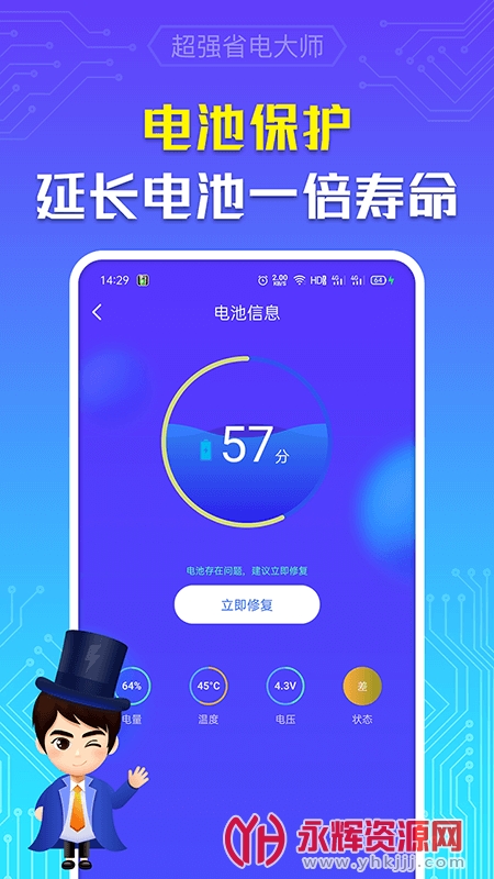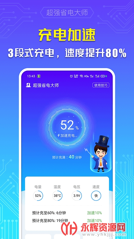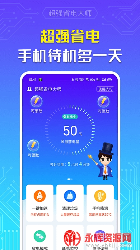 超强省电大师是一款专业的移动端电池优化服务应用软件,旨在增加手机的续航时间。通过识别高耗电的应用程序并自动关闭它们,深度省电,比平时节省电量2到4倍!此外,它还提供了实时查看手机耗电效果、一键提高充电速度、延长电池寿命和检测电池温度等功能。操作简单,一键启动,适配各种手机型号。如果您对这款软件感兴趣的话,不妨来永辉资源网下载体验一番吧!
