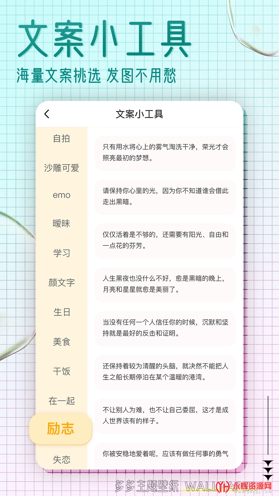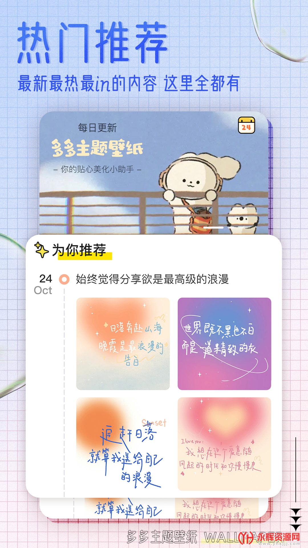 多多主题壁纸是一款深受用户喜爱的移动端掌上手机壁纸应用程序软件。这款软件旨在为用户提供一个多样化的壁纸库。应用中汇聚了各种精美的壁纸主题和风格,从人物到风景,从简约到华丽,满足不同用户的个性化需求。如果您对这款软件感兴趣的话,不妨来永辉资源网下载体验一番吧!