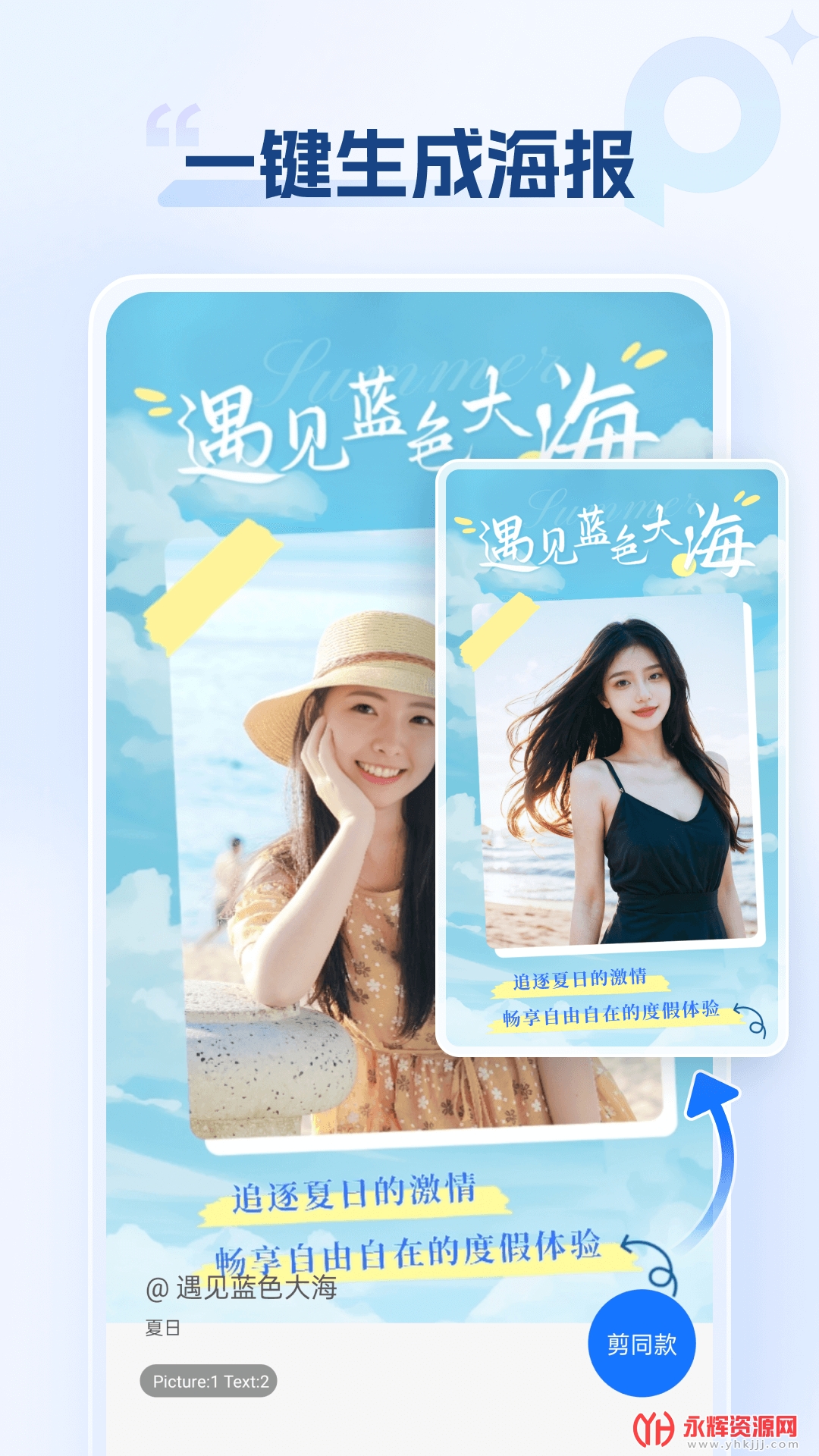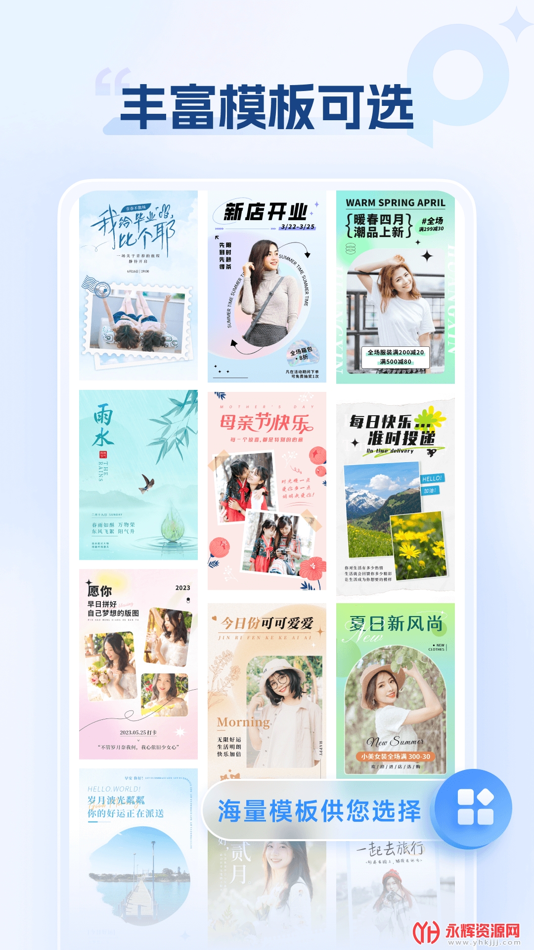 海报设计室是一款非常好用且功能齐全的移动端掌上海报编辑工具应用软件。这款软件集众多功能于一身,用户可以通过它在移动设备上轻松地制作出专业级别的海报作品。无论对于商业推广、节日庆祝还是个人用途,这款软件都能满足用户的各种设计需求。如果您对这款软件感兴趣的话,不妨来永辉资源网下载体验一番吧!