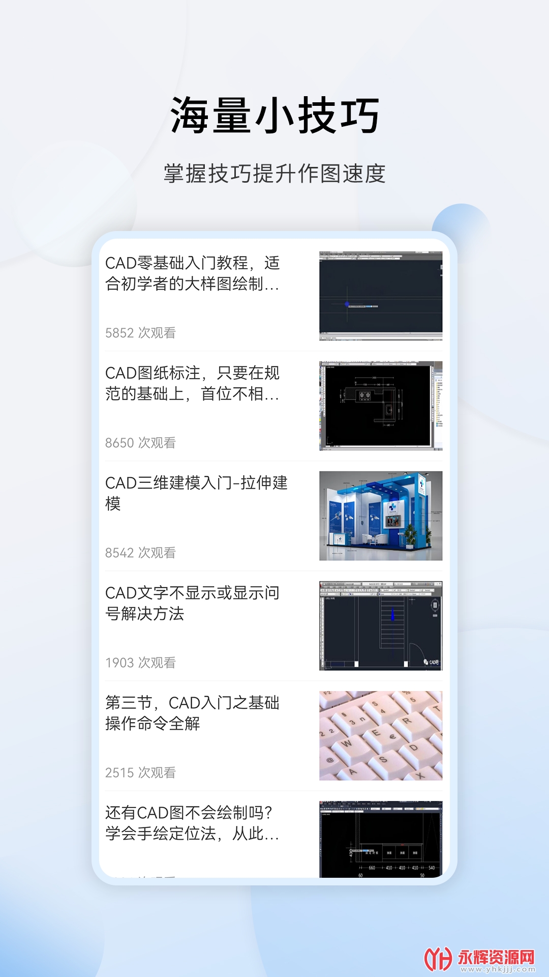 软件中的所有教程都是图文并茂展示每步操作,一键收藏,完全免费!软件为您提供海量CAD教学,您可以通过该软件来掌握工业制图的技能,像软件应用,各种不同场合的制图技巧、方法等等,在软件都能够给你极大的帮助,非常适合机械加工行业从业者。