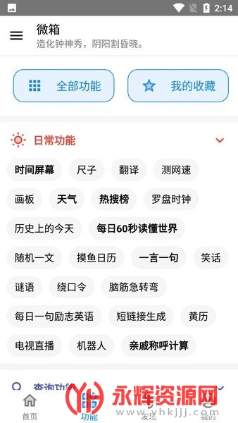 微箱是一款非常好用且功能齐全的移动端掌上手机工具箱应用软件。这款应用软件集多种功能于一体,能够为用户提供一系列实用的小工具,以便用户能够高效地完成日常任务。微箱注重用户体验,以其精简的设计、便捷的操作和轻盈的体积,成为了手机中不可或缺的多功能助手。如果您对这款软件感兴趣的话,不妨来永辉资源网下载体验一番吧!