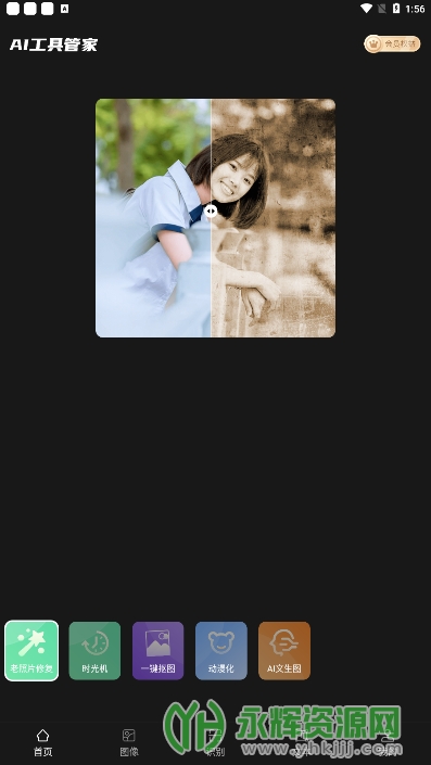 AI工具管家是一款集图像处理、识别和文本生成等多种功能于一身的移动端多功能工具应用软件。除了提供时光机、一键抠图、动漫化等多种功能外,该软件还提供老照片修复、黑白照片上色、照片清晰度增强、照片动漫化等热门功能导航卡片。