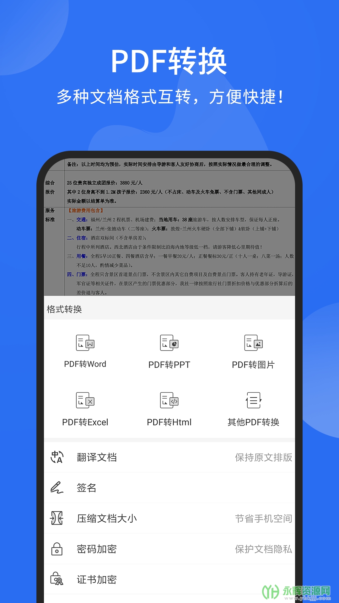 文件转换:能够将PDF转换成Word、JPG、Excel、PPT、HTML等格式,兼容WPS Office文档。