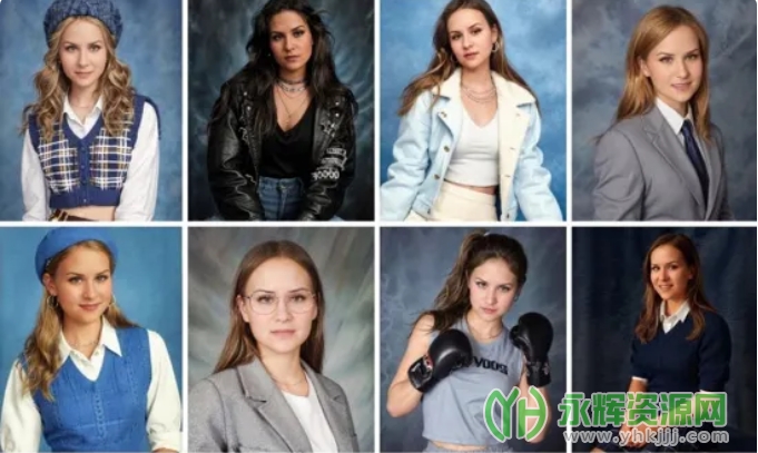 这是一个付费功能。用户上传8-16张自拍照,选择人物性别,系统就会为用户生成多达60张美式复古风校园年鉴照,和同类App比,算是量大管饱了。生成的照片多为深蓝色背景,画质颗粒度较大,自带一层复古滤镜,这和近几个月我们在榜单上频繁看到的登榜复古相机App异曲同工。图片中的用户形象是90年代风格,发带、皮衣、亮色腋下包...极具年代感。