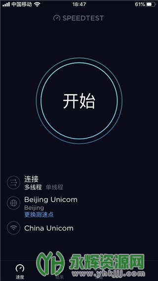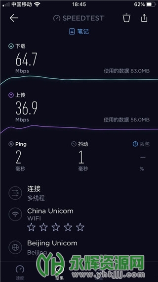 2、测试结果主要为3项:Ping 值,下载速度和上传速度;