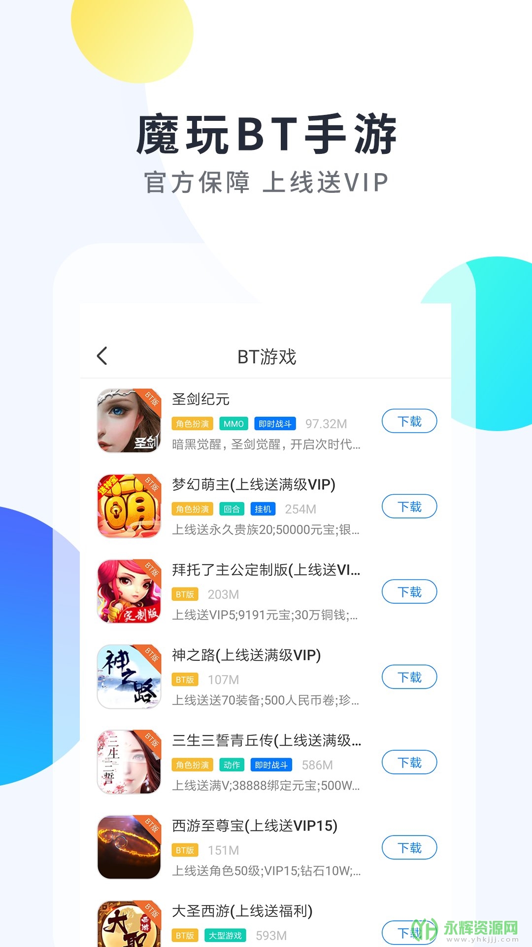 魔玩助手是一款非常好用且游戏资源丰富的移动端掌上在线游戏盒子平台应用软件。这款软件专注为玩家推荐优质手游,拥有海量游戏资源,包括各种精品手游、国际版手游、破解版手游、去广告不氪金等,为玩家提供全面的游戏选择。如果您对这款软件感兴趣的话,不妨来永辉资源网下载体验一番吧!