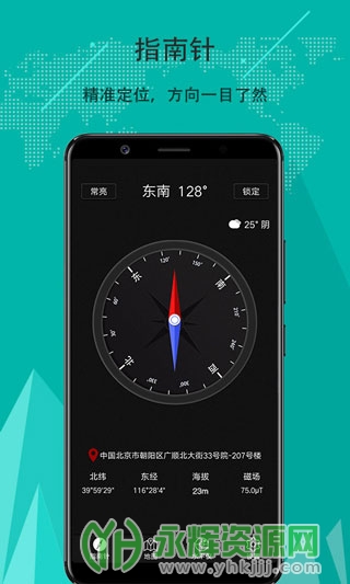 精准指南针是一款集多功能于一体的手机指南针定位工具,专为户外爱好者和旅行者设计,以其高精度和实用性著称。该软件不仅仅是一个方位指引工具,它还整合了位置、地图和多项气象数据,为用户提供全面的旅行辅助。超小内存占用和省电省流量的特性,使其成为户外活动的理想伴侣。如果您对这款软件感兴趣的话,不妨来永辉资源网下载体验一番吧!
