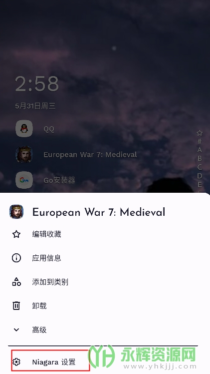5、任意选择一个应用图标,长按图标会出现下图信息,点击Niagara设置。