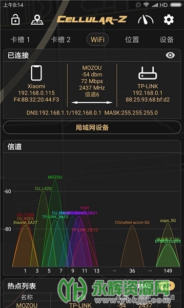实用的电信小区、信号质量及WIFI网络信息、信道查看软件还可以根据信号的强弱程度,根据需要更优化地设置路由器的位置。cellularz还可以用来获得当前的位置信息、GPS卫星图和相关的设备信息等,十分便捷,同时可以查看实时wifi列表信息。