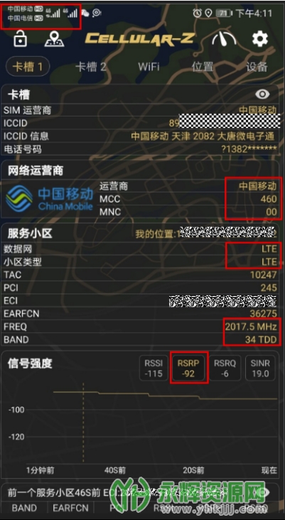 下图是软件的截图,其中RSRP代表基站的信号强度,-92代表信号一般,可以基本维持通话和上网;