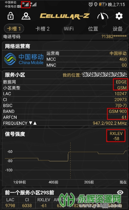 将手机网络固定到2G模式,查看信号质量和卡所在频段。(以卡1 移动卡固定到2G网络为例),通过软件查看当前处于GSM 900的频段;