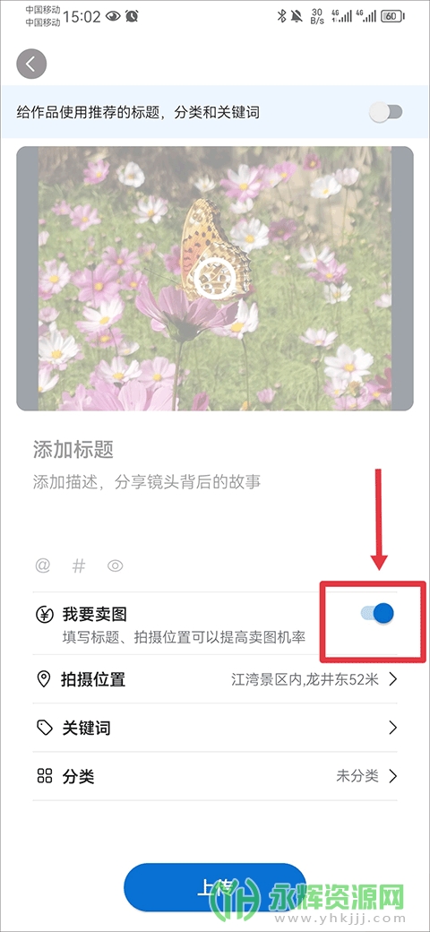 4、点击后会跳转至相册,在相册中选择你要上传的图片和视频,选择完成后在上传作品前将我要卖图开启并点击上传即可