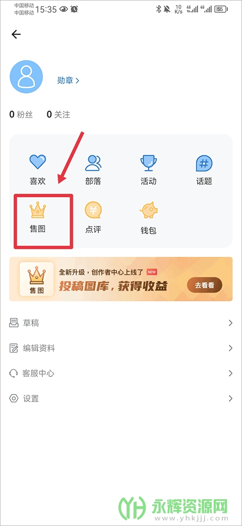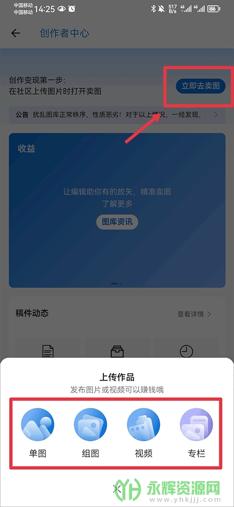 3、接着在创作者中心点击立即去卖图,并在上传作品中选择上传单图、组图、视频还是专栏