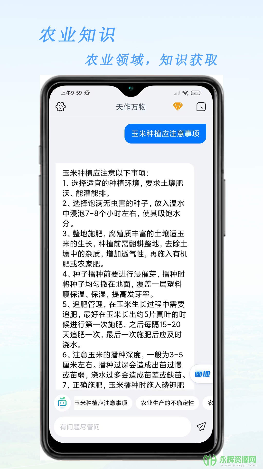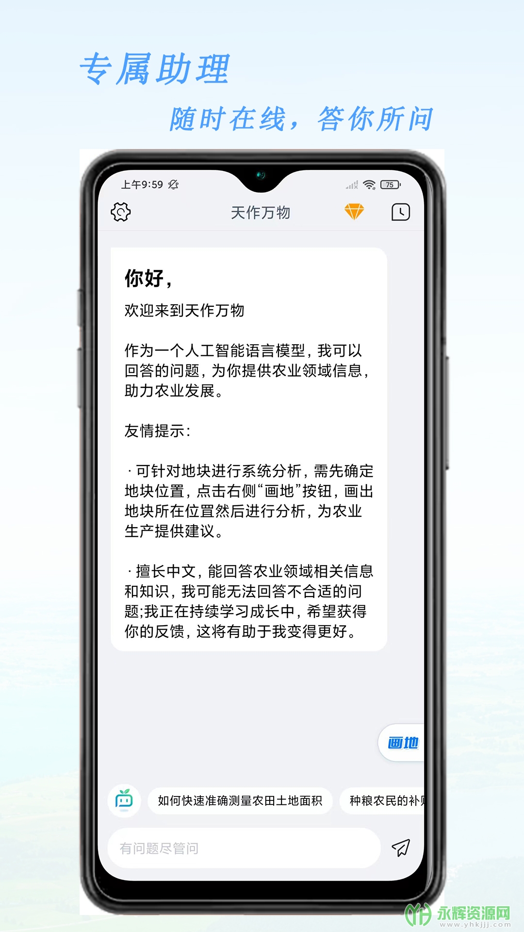 天作万物是一款专注于农业领域的移动端掌上人工智能语言模型应用软件。这款软件通过智能对话和地块信息获取等功能,为用户提供高效的农业管理和规划体验,并提供农业领域相关信息和知识的智能问答服务,解答用户问题,为农业生产提供建议。如果您对这款软件感兴趣的话,不妨来永辉资源网下载体验一番吧!