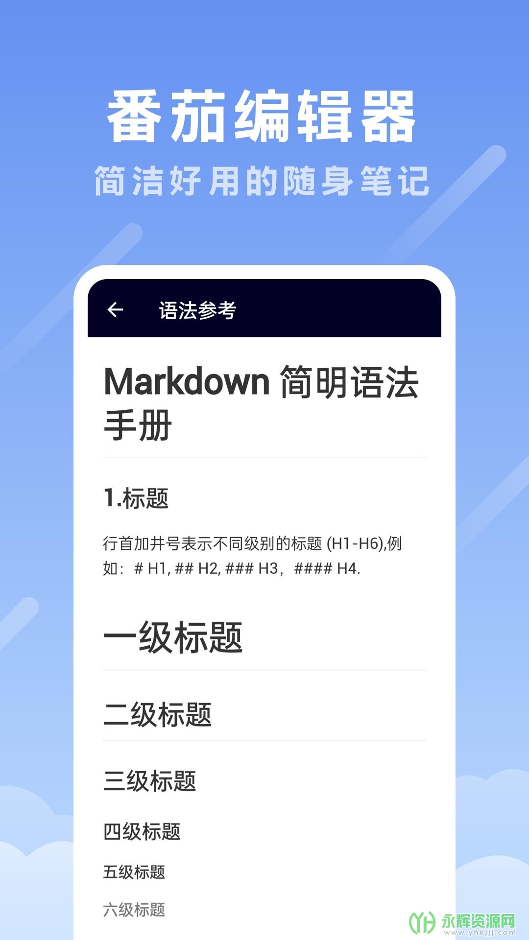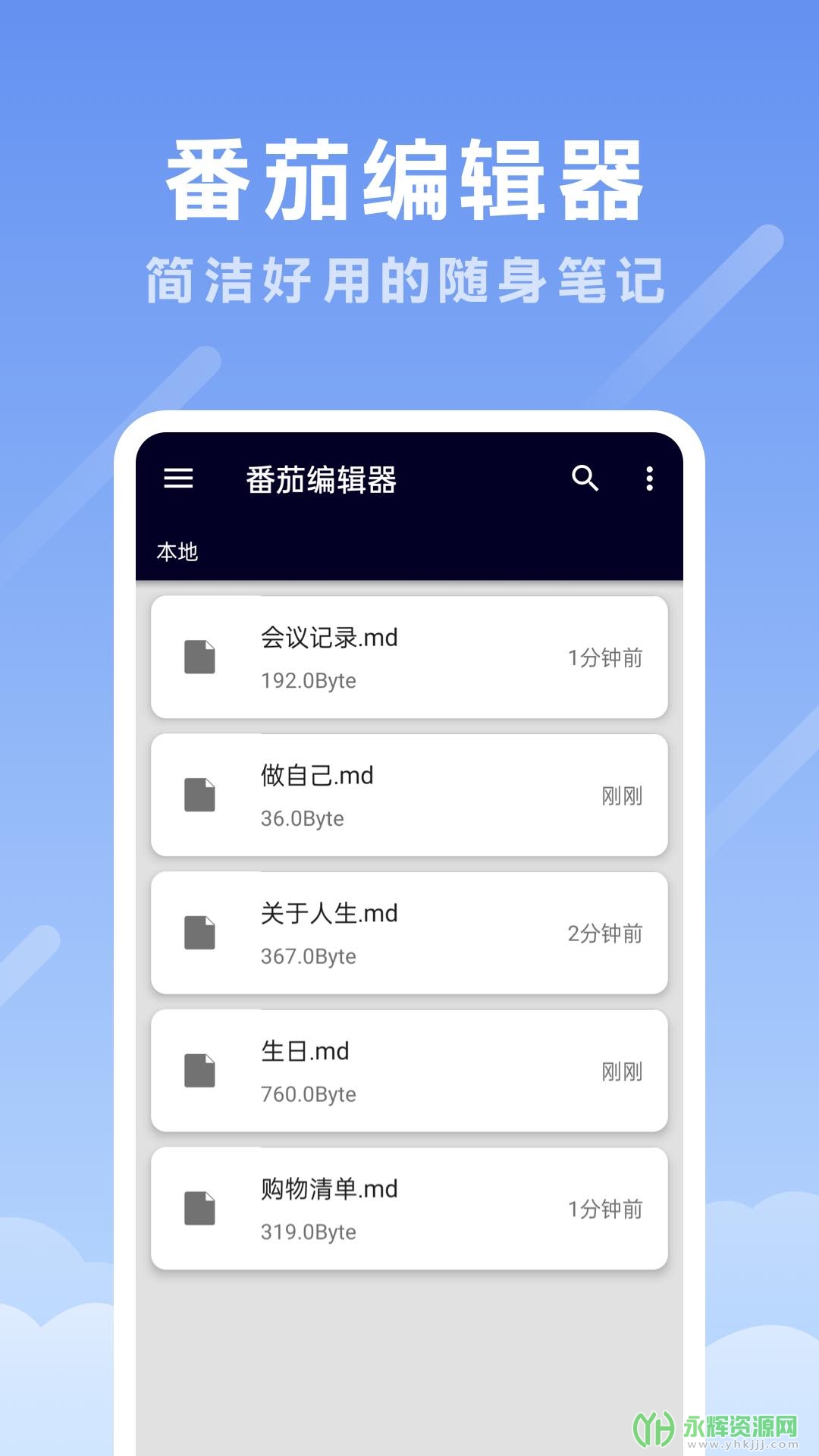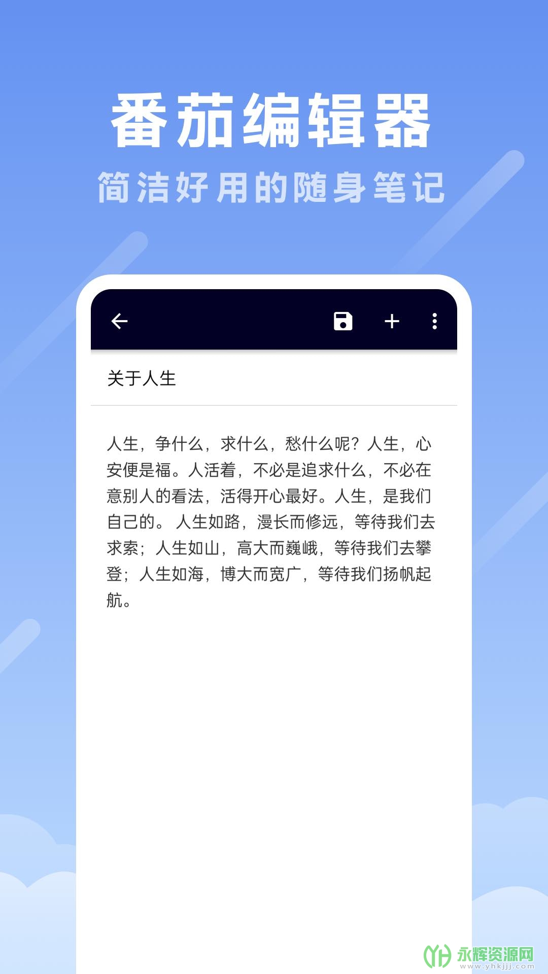 番茄编辑器是一款非常好用且功能齐全的移动端掌上文本编辑应用软件。这款软件专注于提升工作效率,拥有丰富的文本格式化选项、自动保存功能,以及独特的倒计时和番茄时钟功能,帮助用户更好地管理时间并专注于任务。如果您对这款软件感兴趣的话,不妨来永辉资源网下载体验一番吧!
