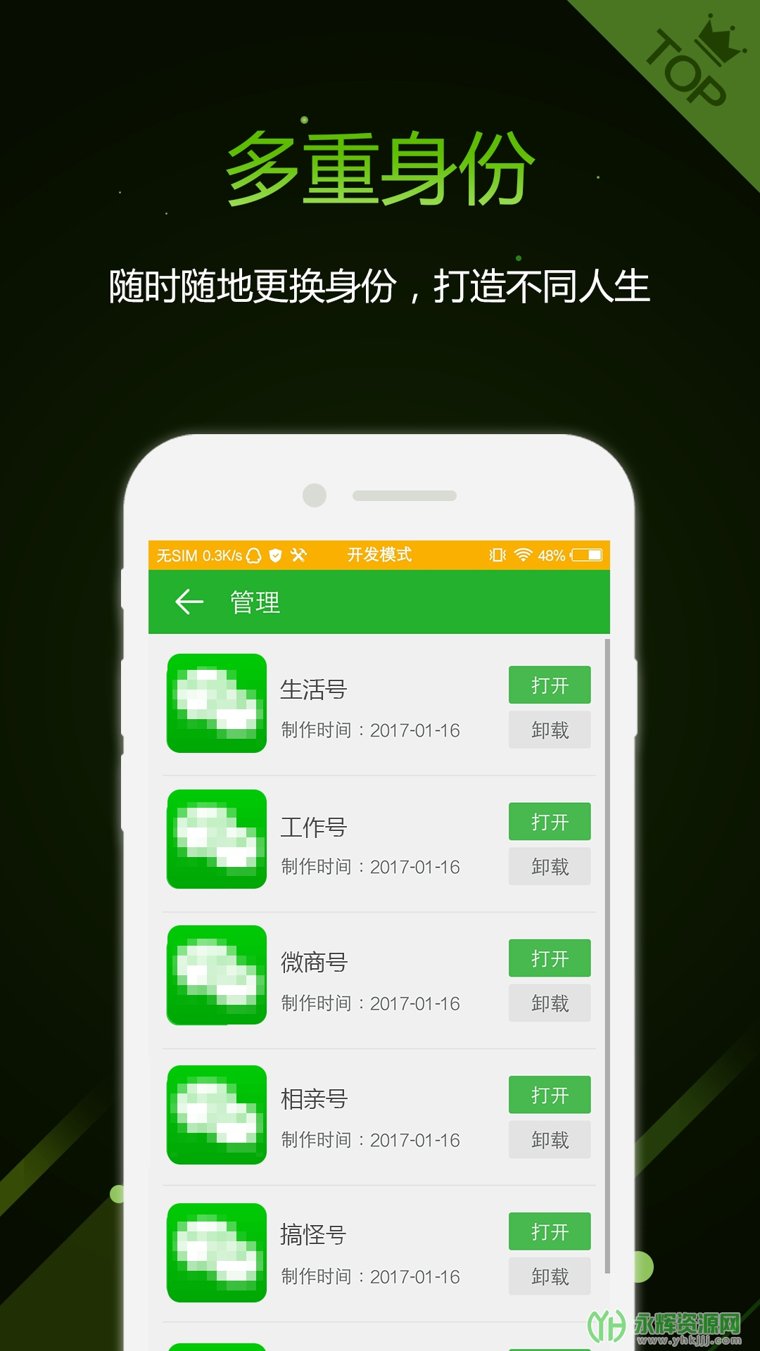 高达99个账号:最多支持99个账号的多开,省去切换账号登录的麻烦。