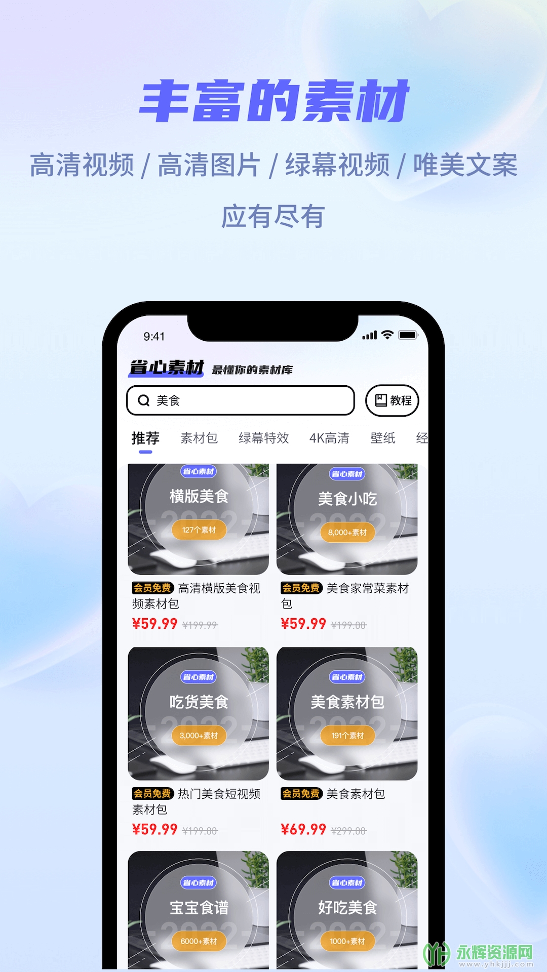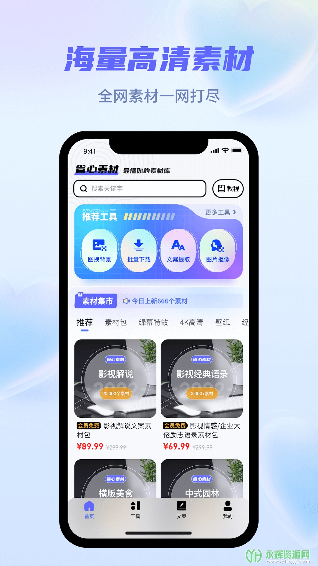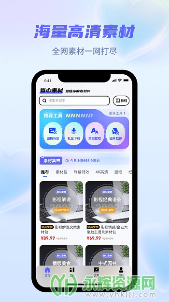 省心素材是一款非常好用且功能齐全的移动端掌上视频剪辑素材库服务平台应用软件。这款软件汇集了丰富优质素材,能够为用户提供视频、图片、文案等创作素材,旨在帮助用户轻松创作内容。如果您对这款软件感兴趣的话,不妨来永辉资源网下载体验一番吧!