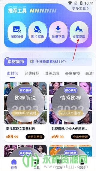 1、进入省心素材app,点击主页推荐工具的文案提取;