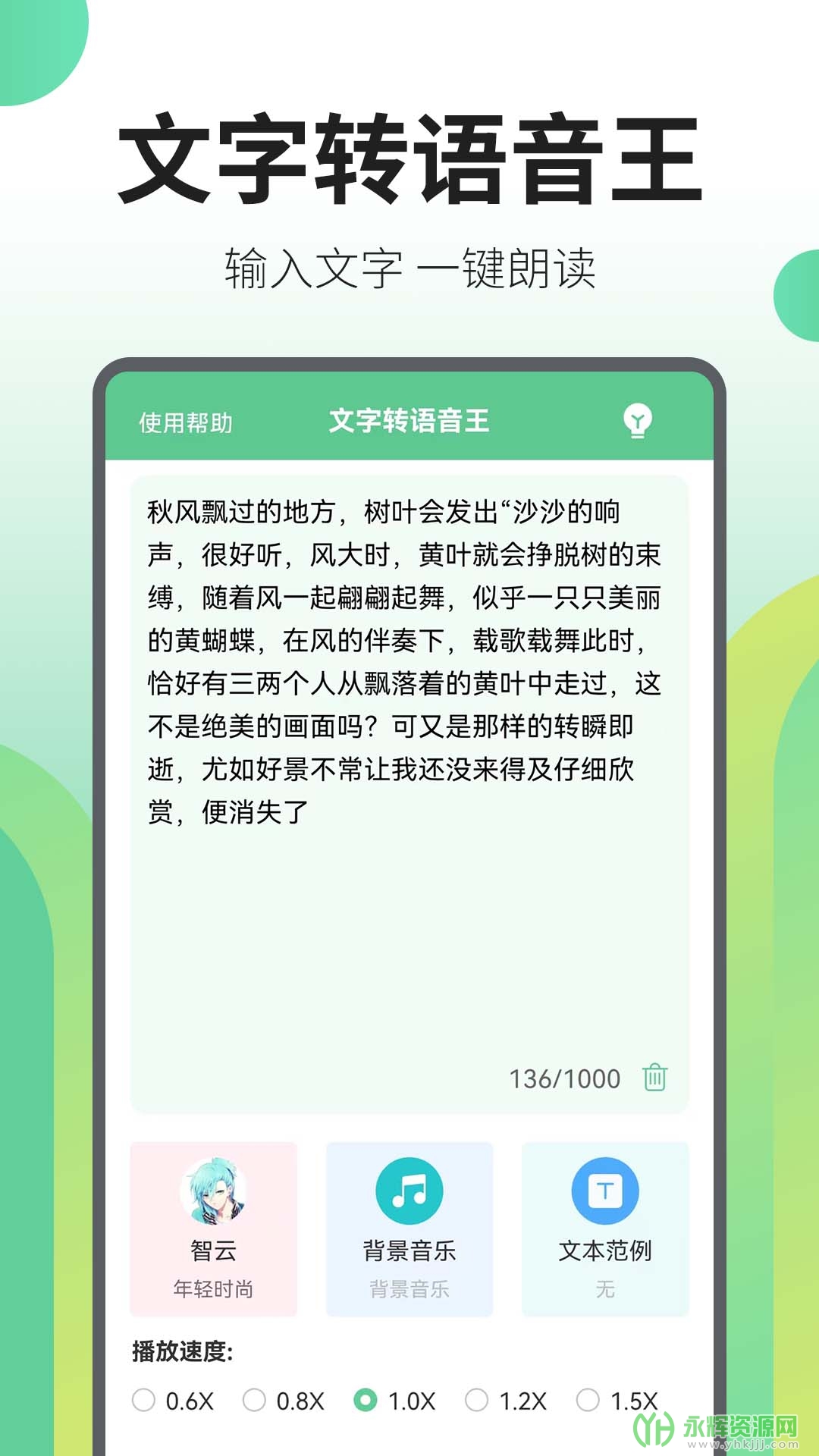 文字转语音王是一款非常好用且功能强大的移动端掌上在线配音平台应用软件。这款软件专注于文字语音转换功能,能够为由用户提供AI智能配音、语音转换等功能,让用户轻松实现文字转语音操作。如果您对这款软件感兴趣的话,不妨来永辉资源网下载体验一番吧!