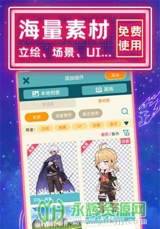 唤境教程中使用的美术素材用户可自由使用,点击免费游戏素材可以进入素材下载页面。