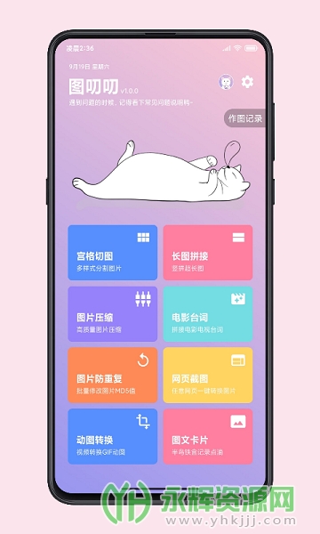 1、功能丰富:包含宫格切图、模板拼图、长图拼接、电影台词制作、图片水印、图片打码、图片压缩、图片防重、视频转动图、图片PDF转换、氢壁纸制作等功能,满足用户多样化的编辑需求。
