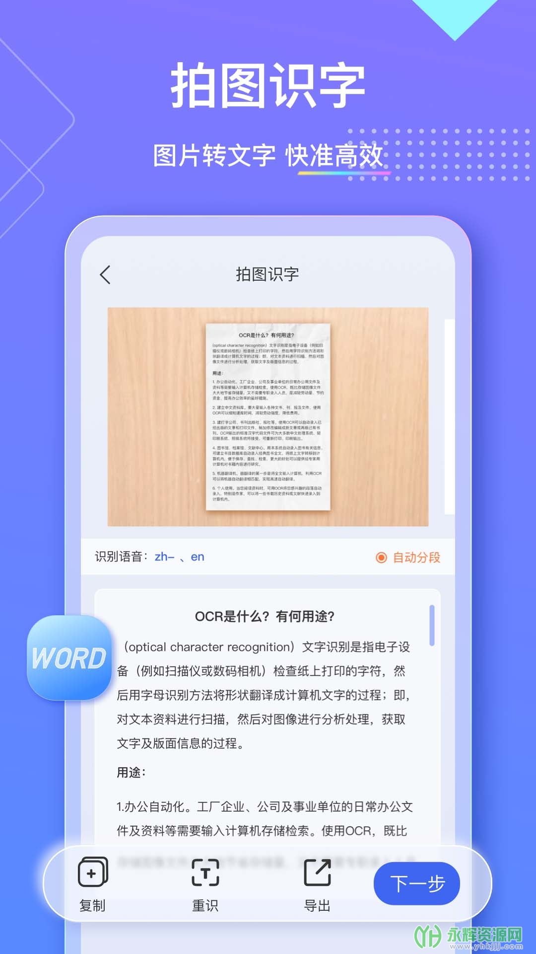拍图转Word:直接将拍摄的图片快速转换为Word文档。