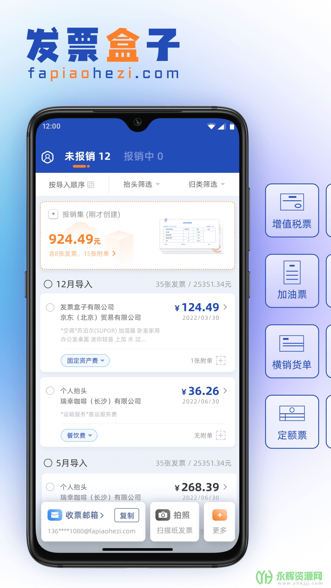 发票盒子是一款高效的电子发票管理和整理工具,旨在帮助个人及企业用户轻松管理发票记录。通过智能科技的应用,发票盒子免除了传统手动整理发票的烦恼,提供安全、便捷的发票处理方式,让发票管理变得简单易行。如果您对这款软件感兴趣的话,不妨来永辉资源网下载体验一番吧!