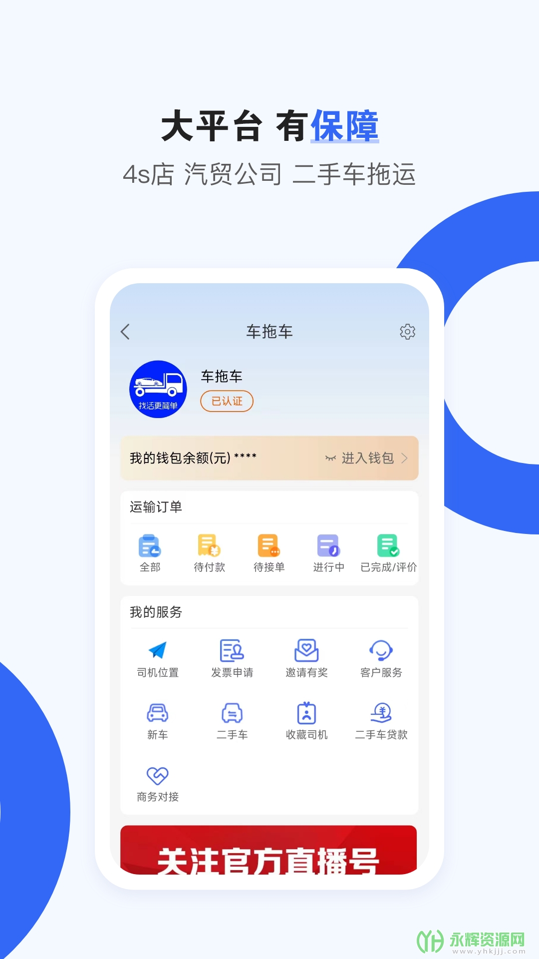 车拖车是一款专业的车辆托运平台软件,旨在为车辆托运过程提供高效、透明、安全的服务。用户只需简单的操作即可完成车辆托运订单,并能实时跟踪车辆运送状态。它是汽车修理厂、车辆经销商、私人车主等需要进行车辆搬运的最佳助手。如果您对这款软件感兴趣的话,不妨来永辉资源网下载体验一番吧!