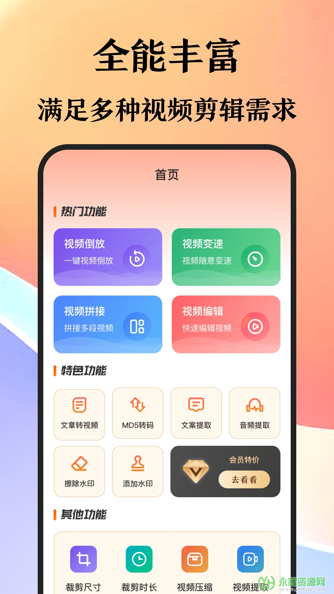 这款软件还支持对图片和视频的编辑,可以将视频进行剪辑拼接,让视频变速,制作个性化的视频相册等等。此外,软件还支持加背景音乐、字幕、滤镜等等,还可以去水印加水印,非常方便。该软件的优势在于提供多种网红热门视频特效模板,支持视频压缩、去水印等功能,并支持高清视频剪辑导出。