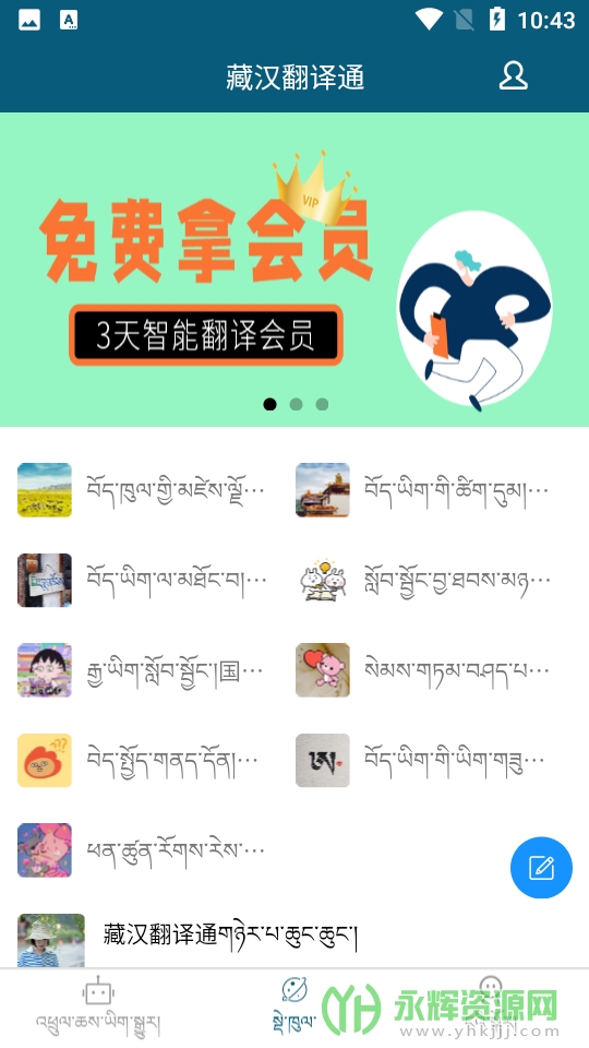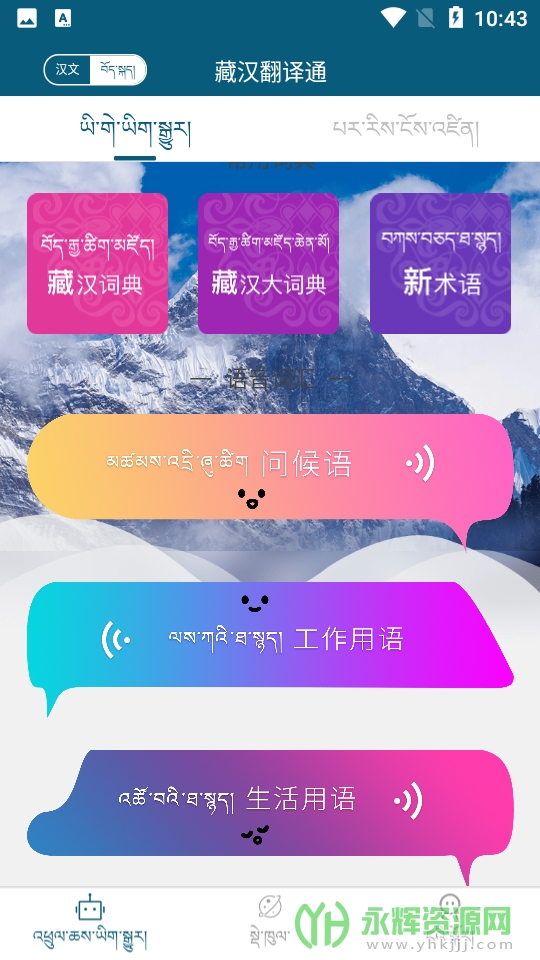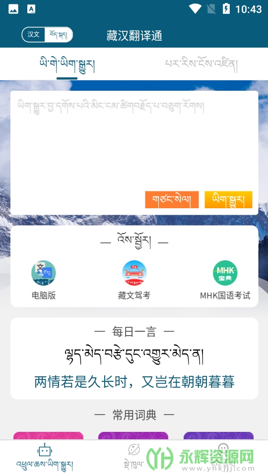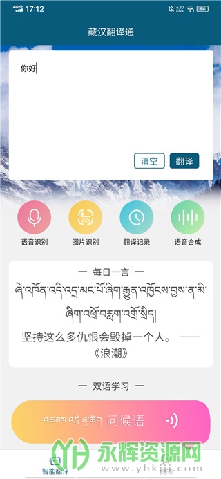 藏汉翻译通是一款非常专业且功能强大的移动端掌上在线藏语翻译助手应用软件。这款软件能够为用户提供智能藏文翻译、藏文识别功能,支持语音输入翻译,图片识别和离线词库功能,还提供牌照识别功能,一键拍照识别内容快捷翻译。如果您对这款软件感兴趣的话,不妨来永辉资源网下载体验一番吧!