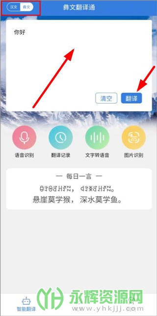 彝文翻译通是一款专注于彝族语言翻译学习的智能应用软件。该软件集成了先进的翻译引擎和语音合成与识别技术,不断优化翻译质量,为用户提供准确、快速、便捷的翻译服务。尤其欢迎凉山彝族自治州、楚雄彝族自治州、红河哈尼族彝族自治州、彝族自治县的用户来体验。