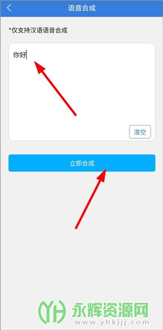 4、打开文字转语音翻译,输入内容,点击立即合成,即可转换成语音;