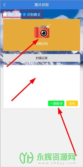 5、打开图片识别,左上角选择识别的文字,输入文字或者选择照片,点击一键翻译即可。